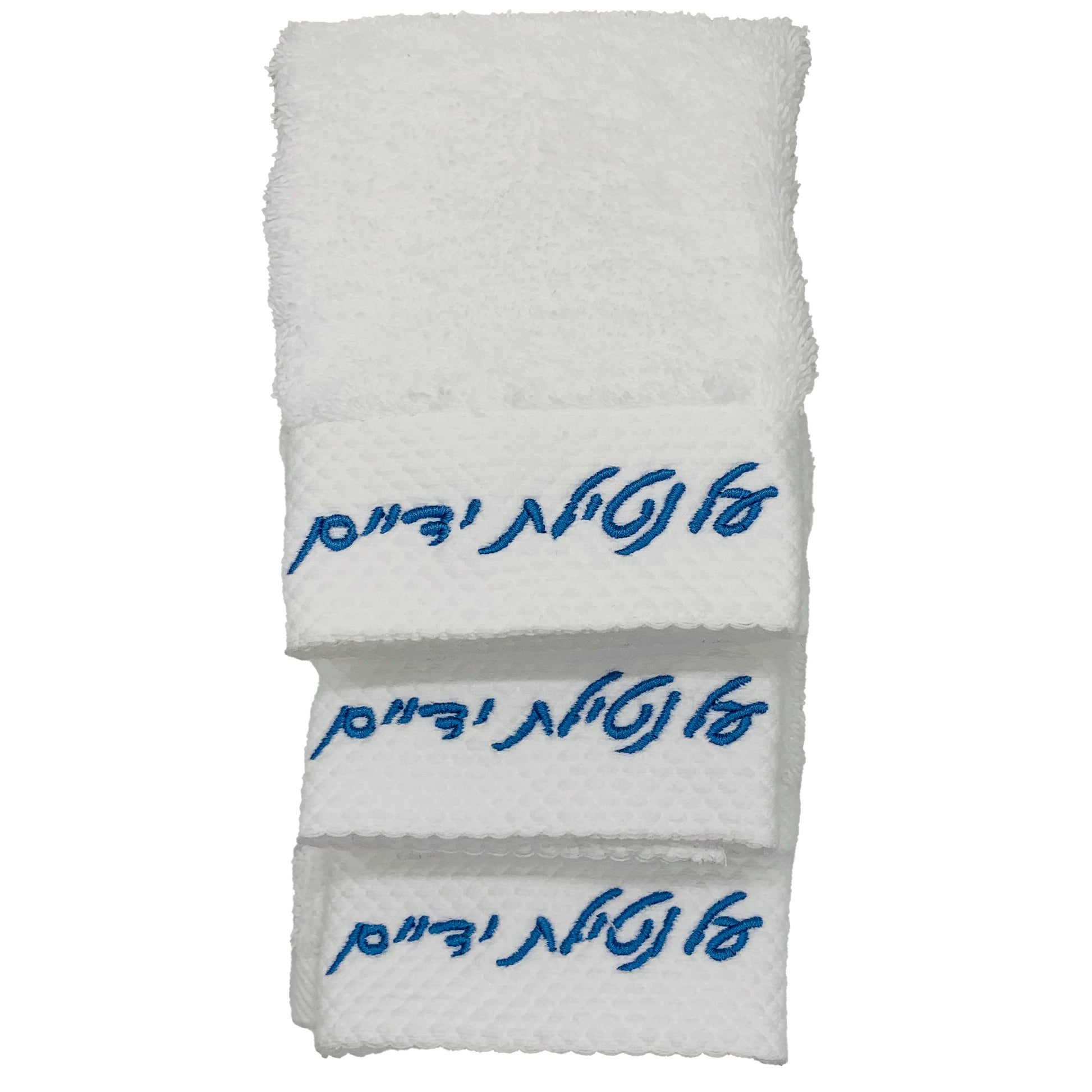 Pack of three soft Embroidered Towels, על נטילת ידיים in Blue. 12 x 12” great Hanukkah or hostess gift.