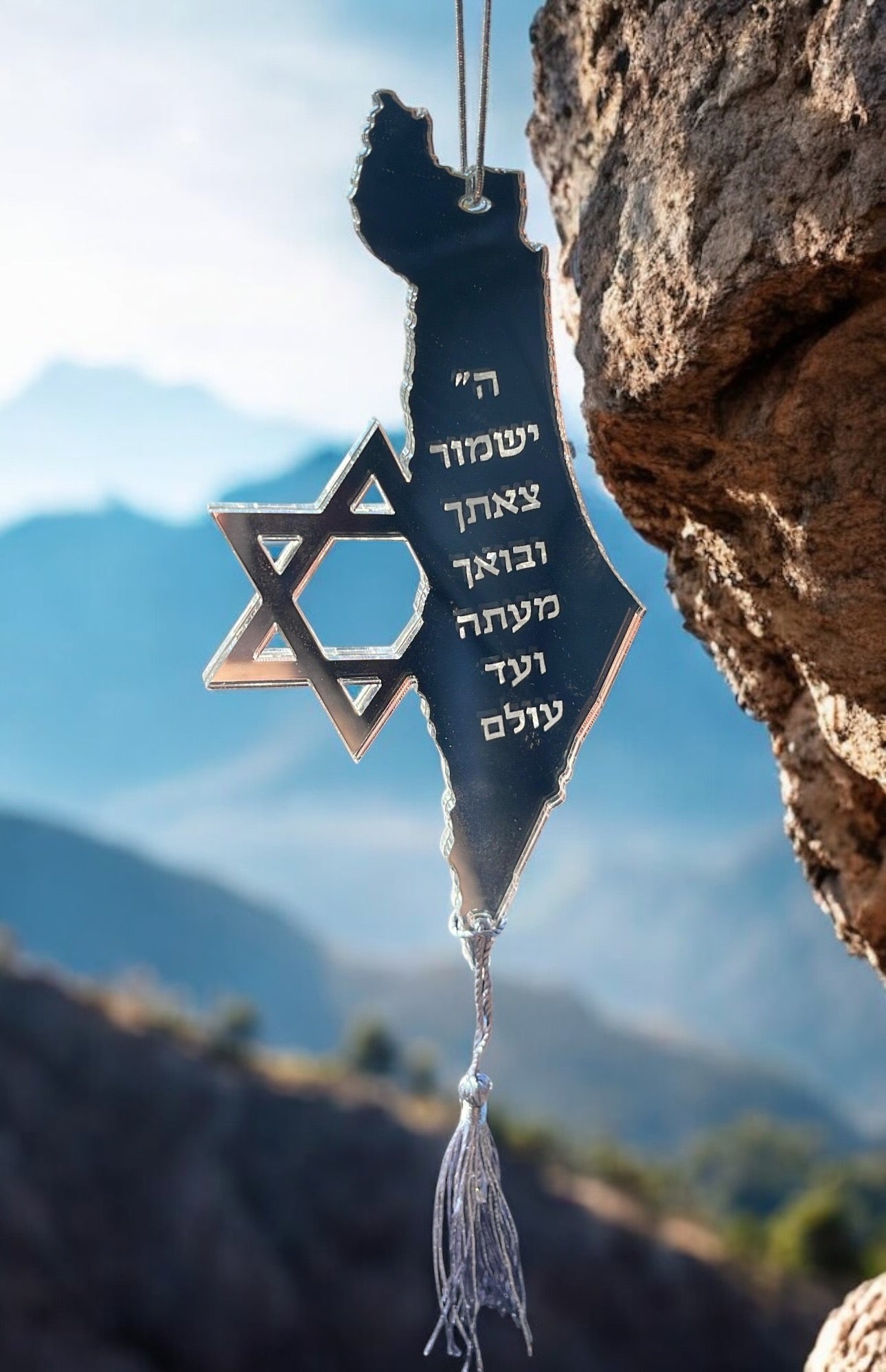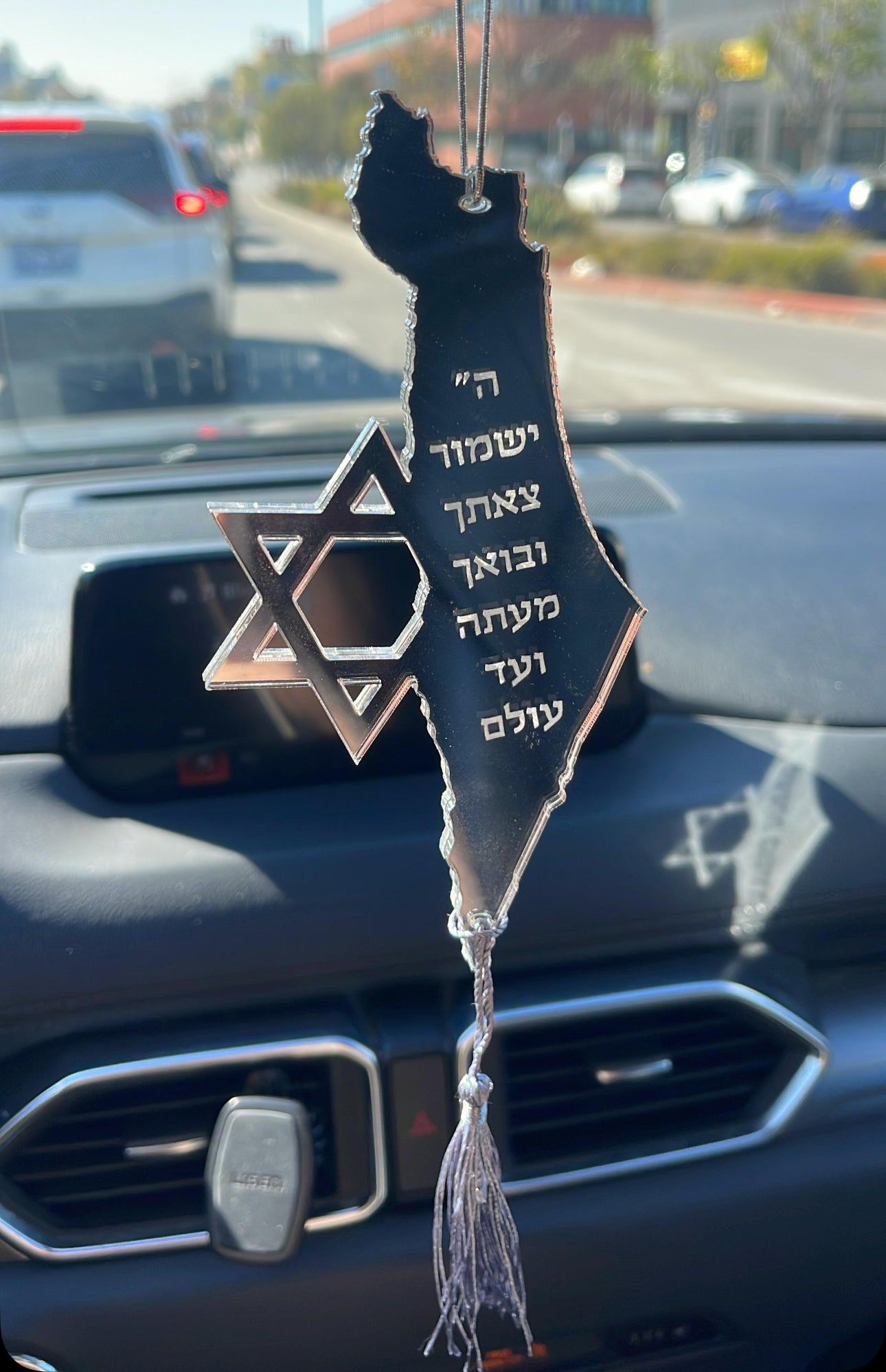 This elegant 6-inch acrylic car charm features a silhouette of Israel adorned with the Hebrew “Blessing of the Way” (Tefilat HaDerech), invoking protection for all your journeys. A Star of David accent enhances its design, symbolizing faith and connection. The reflective acrylic finish adds a sleek, modern touch, while the soft tassel brings a traditional element. Hang this meaningful charm in your car to carry the blessing of safe travels wherever the road takes you.