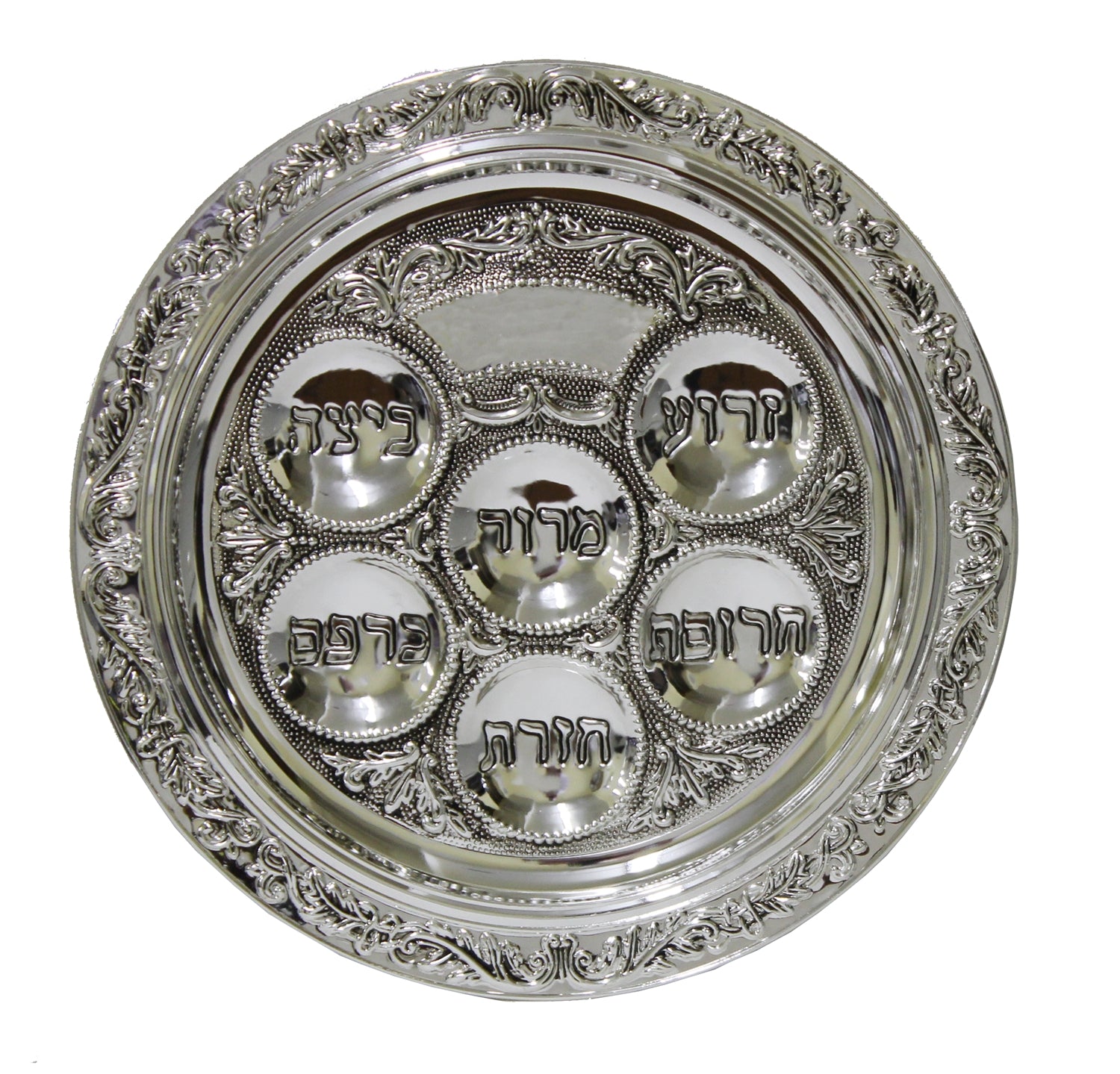 What could be more fitting for your Pesach table than this amazing nickel-plated metal Seder plate? With six bowls adorned with the name of each of the ritual foods placed inside them at the Seder meal in Hebrew and English. At the top is written Pesach and Passover in Hebrew and English. Decorated with circular and floral patterns in the interior and shells around the edges, this wonderful plate will make the perfect centerpiece for your Seder table or a flawless Passover gift for someone close!