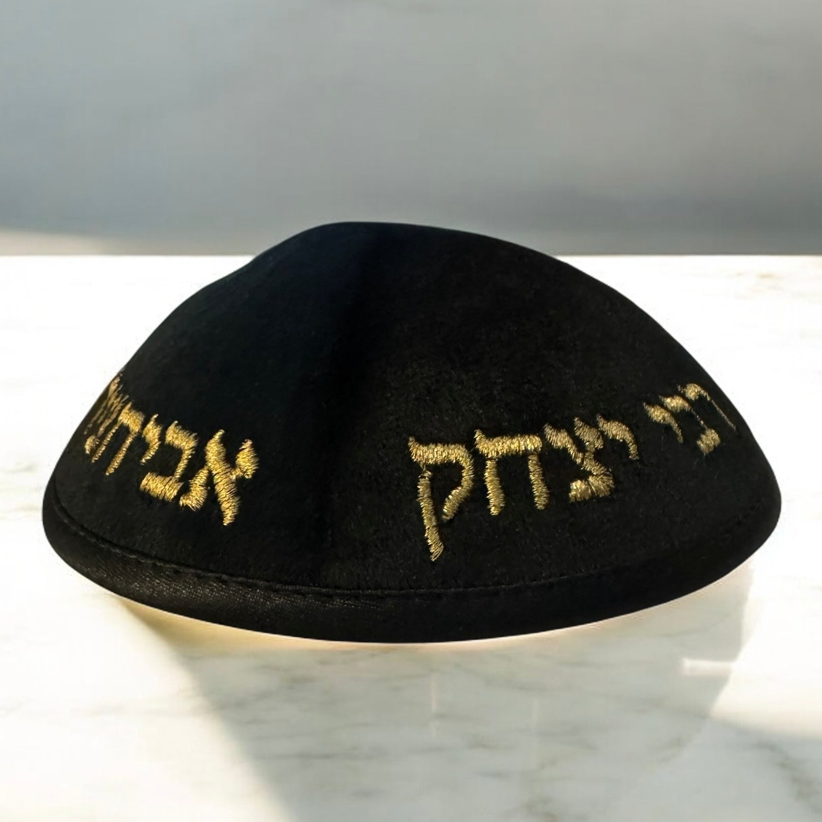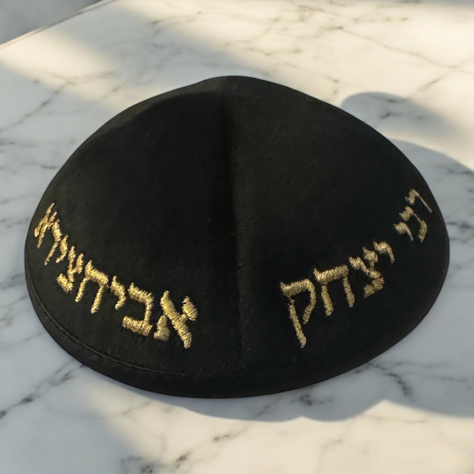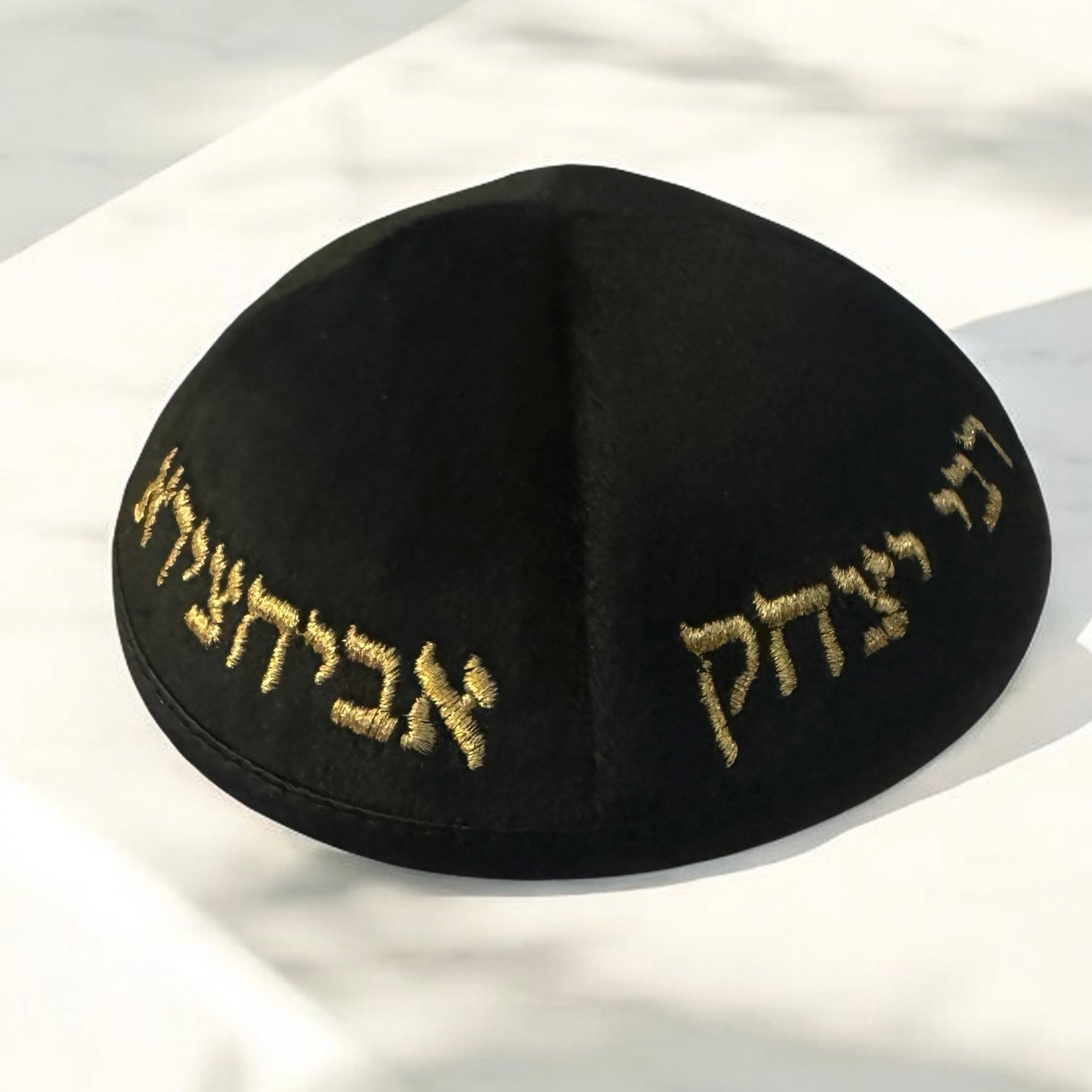 Description: This stunning 19 cm black velvet kippah is embroidered with “רבי יצחק אביחצירא” in elegant gold lettering, honoring the legacy of Rabbi Isaac Abuhazira. Designed for both style and practicality, it features a built-in hair clip for a secure and comfortable fit. Ideal for daily wear or special events, this kippah seamlessly combines tradition and elegance.
