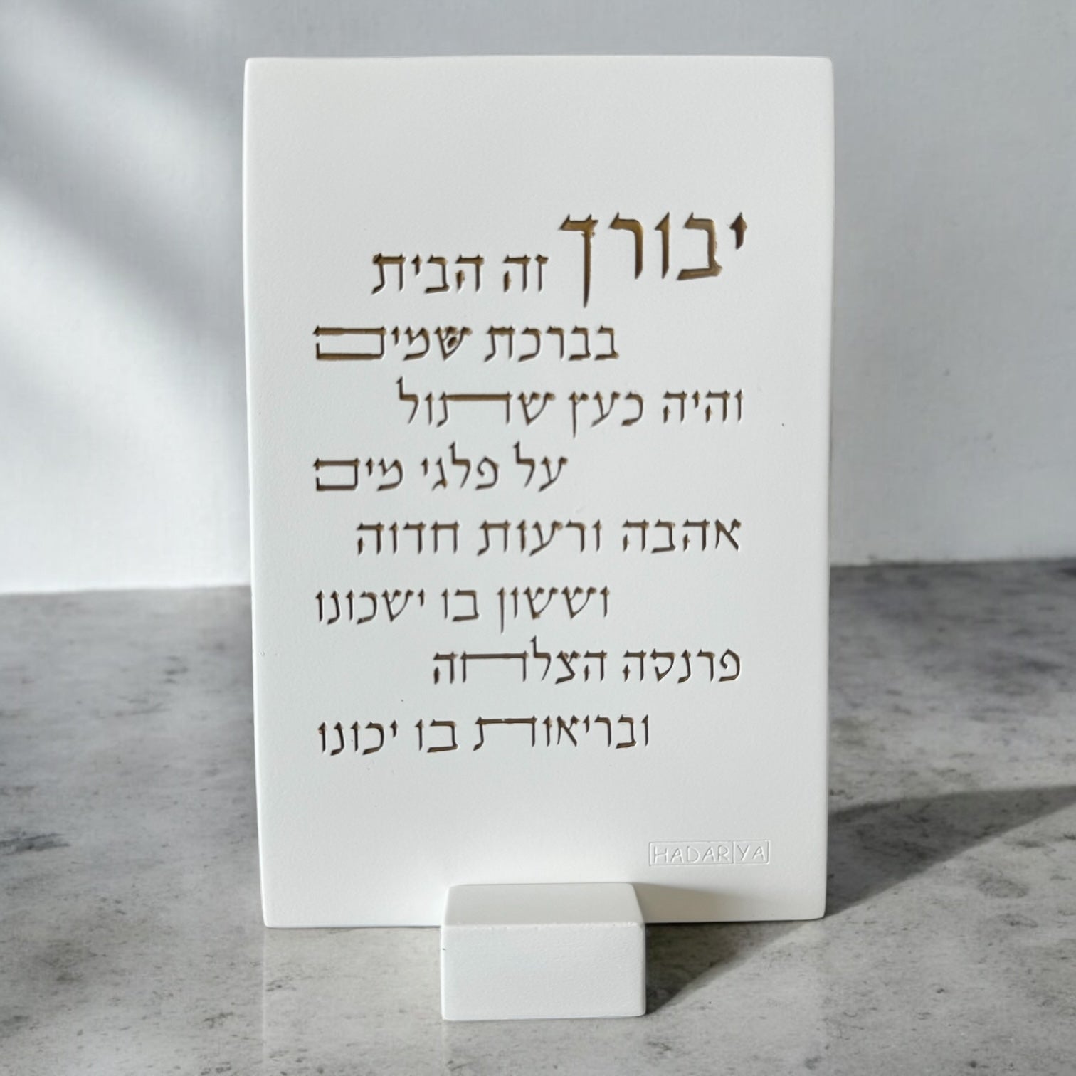 Add a touch of elegance and tradition to your home with our exquisite Cement Home Blessing Stand. Measuring 5 x 7 inches, this beautiful piece features the traditional Birkat Habait (Home Blessing) inscribed in Hebrew, making it a perfect addition to any living space or entryway.