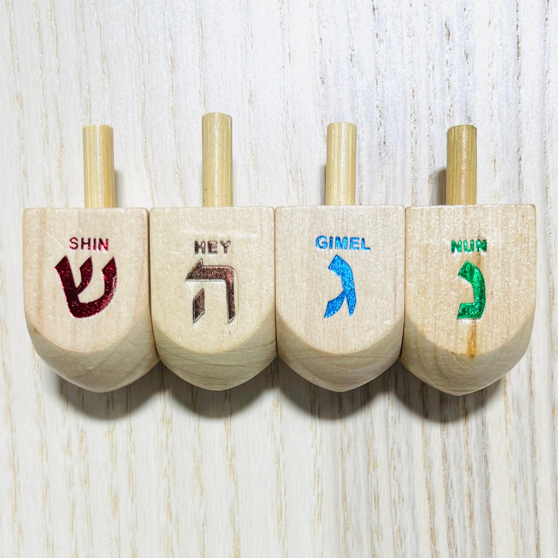 Each dreidel is painted with a letter on each side, נ ג ה פ, for “Nes Gadol Hayah Po” (“A Great Miracle Happened Here.”)