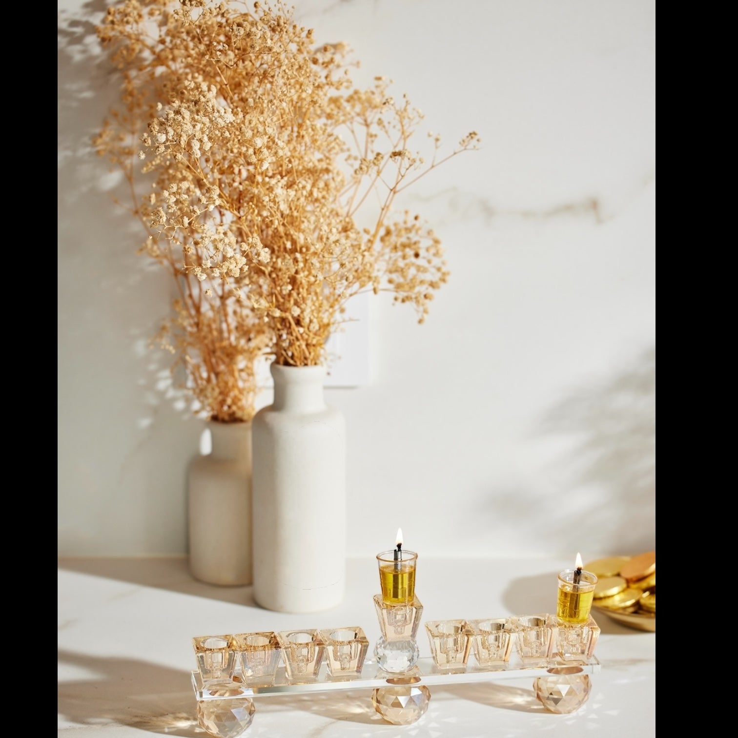 (Copy) Metal "Harp" Menorah 36 cm with Golden Crystal Cups-Rose gold Finish