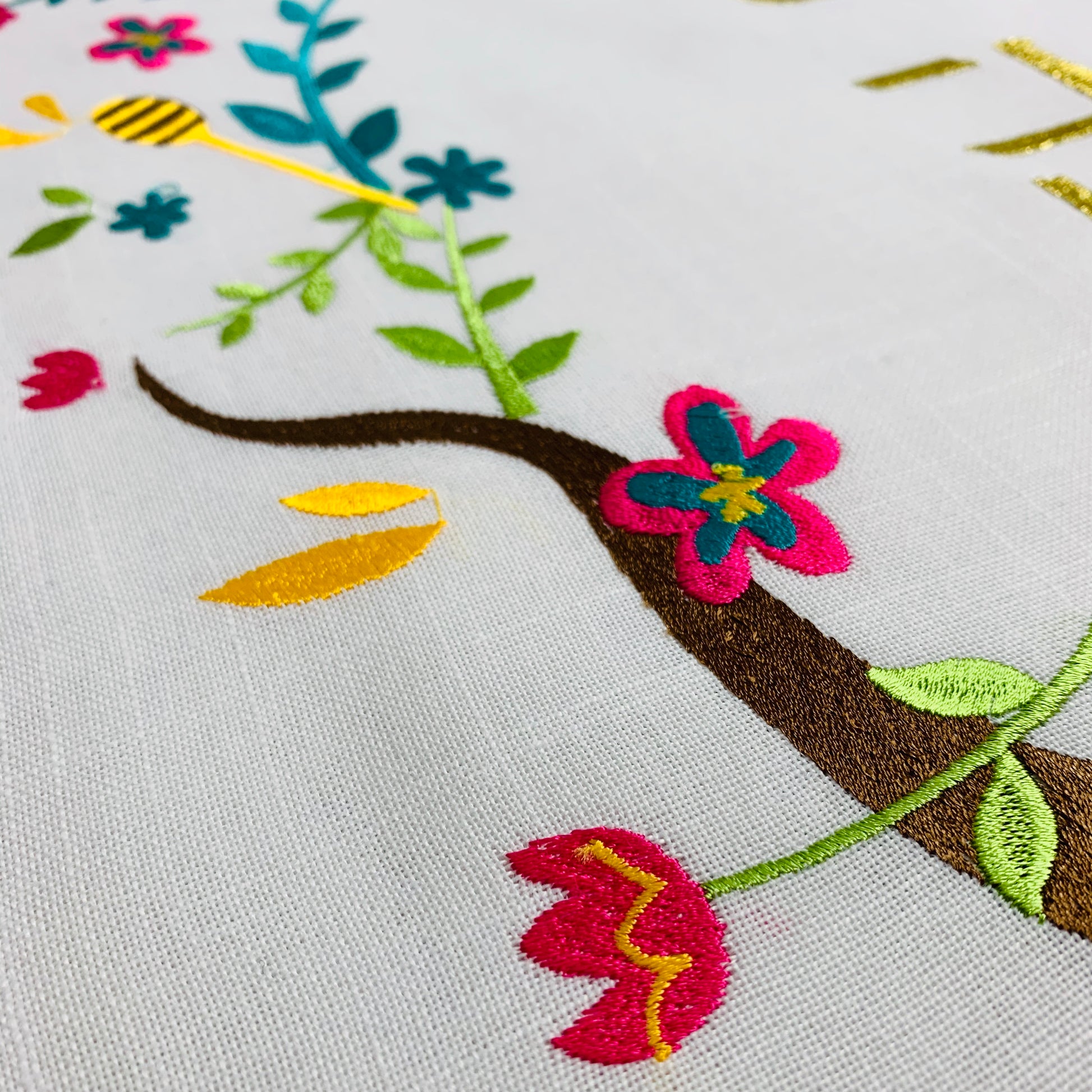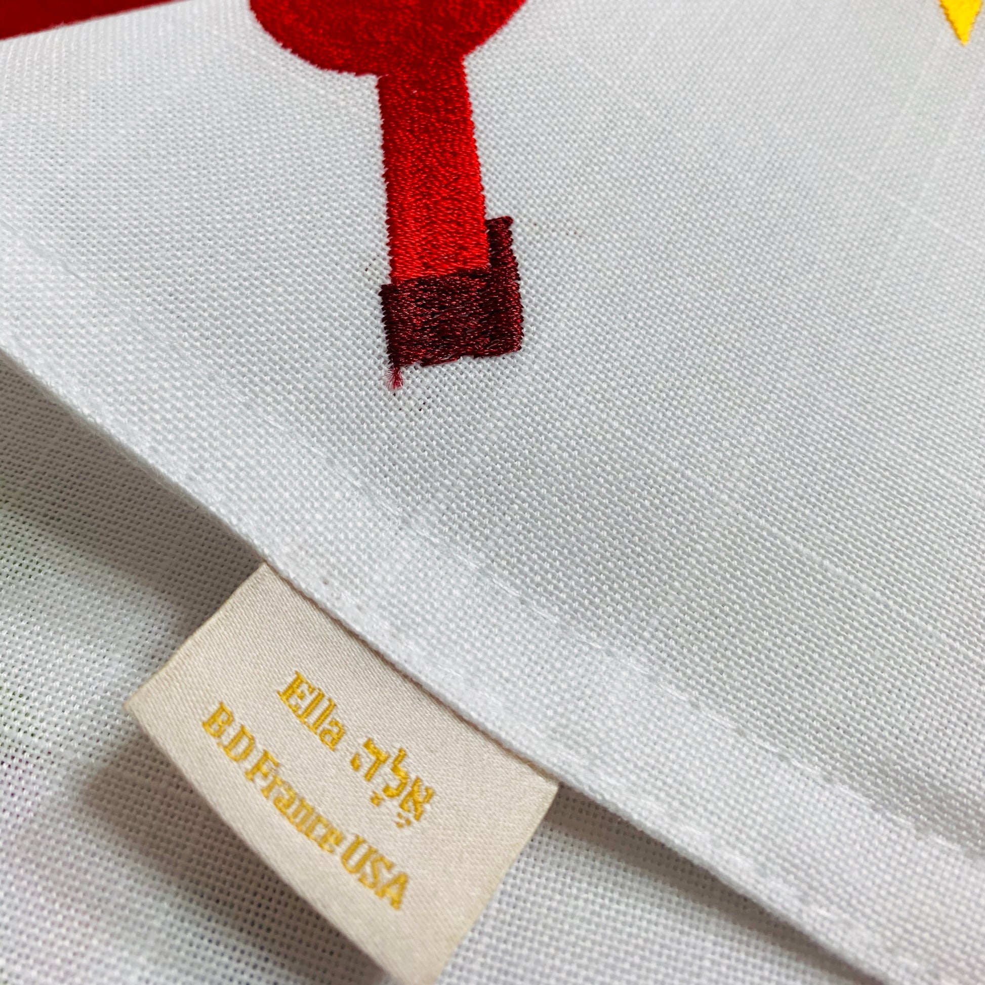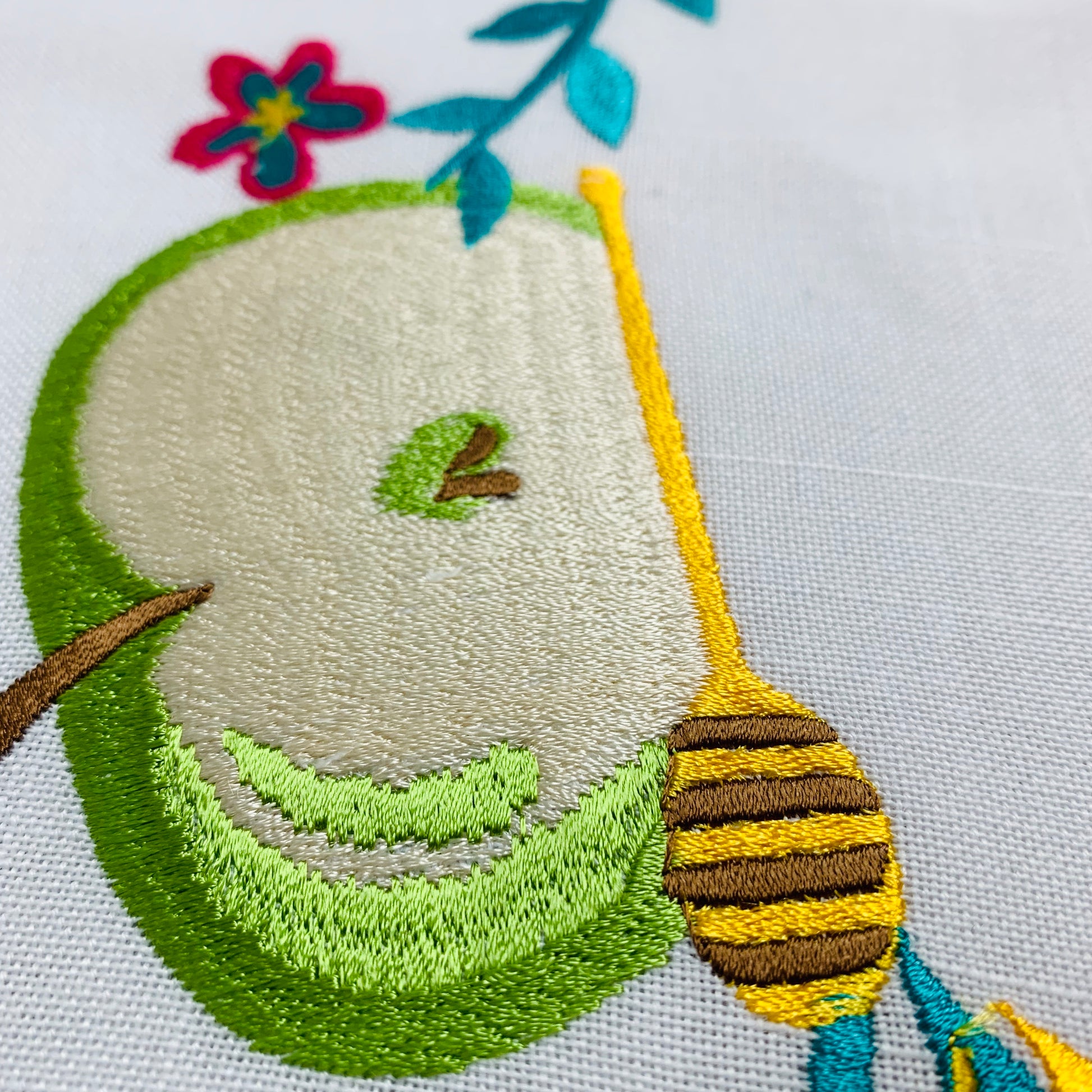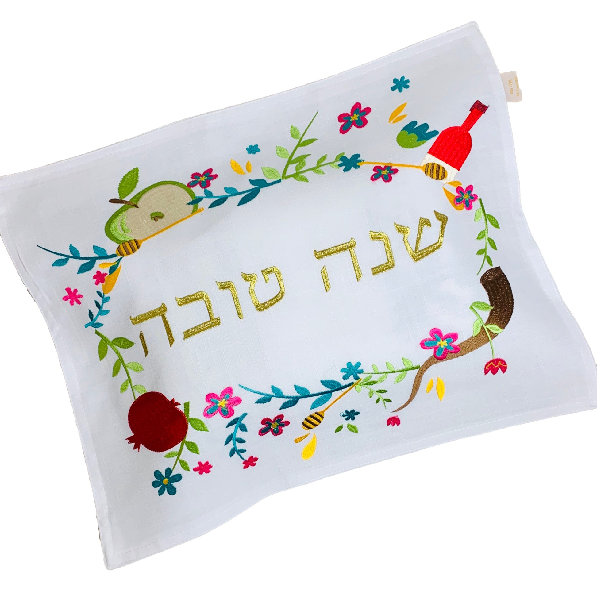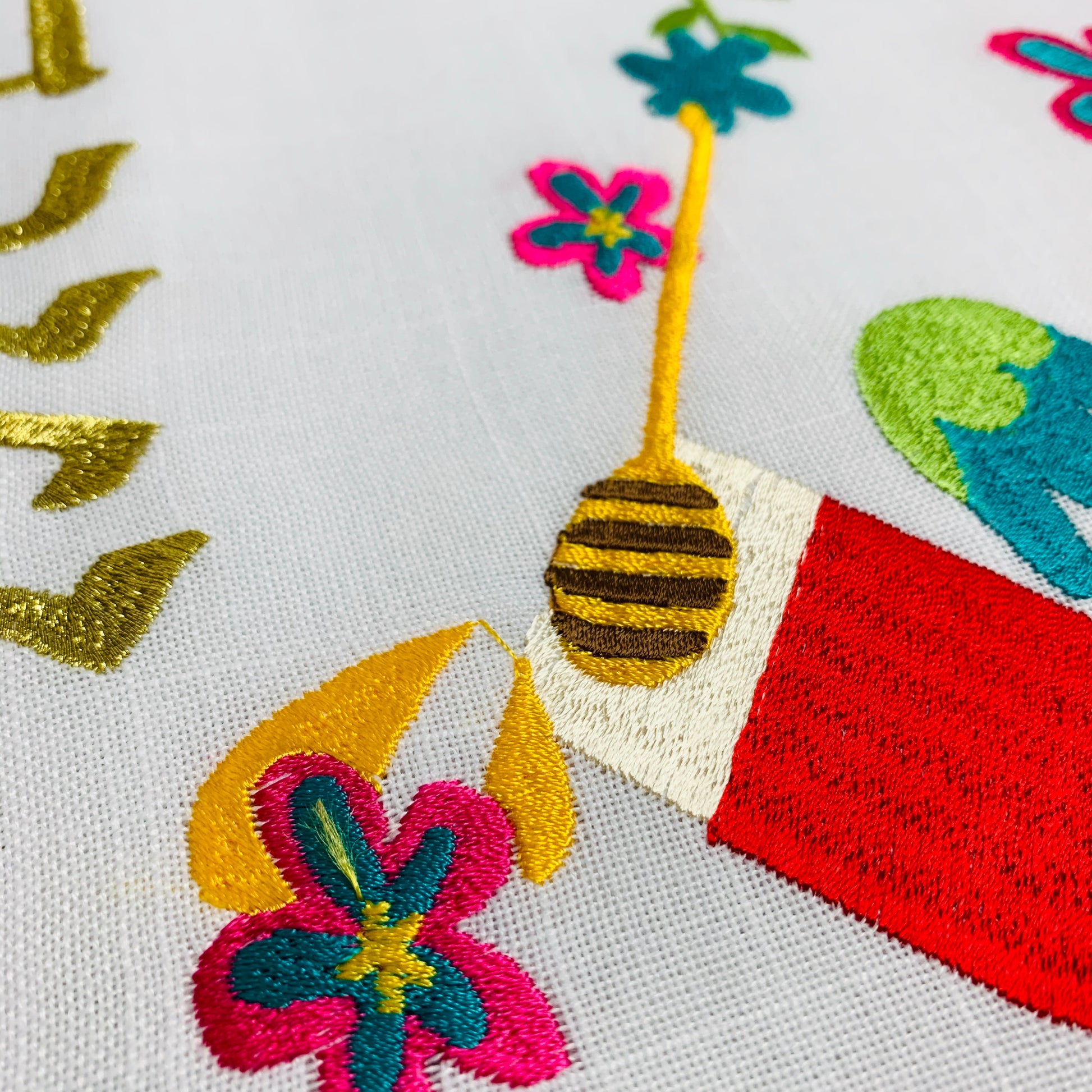 This gorgeous and colorful challah cover is made from 100% linen and features delightful embroidery of classic Rosh Hashana imagery, including apples, honey, pomegranates, wine, shofar, and flowers.
