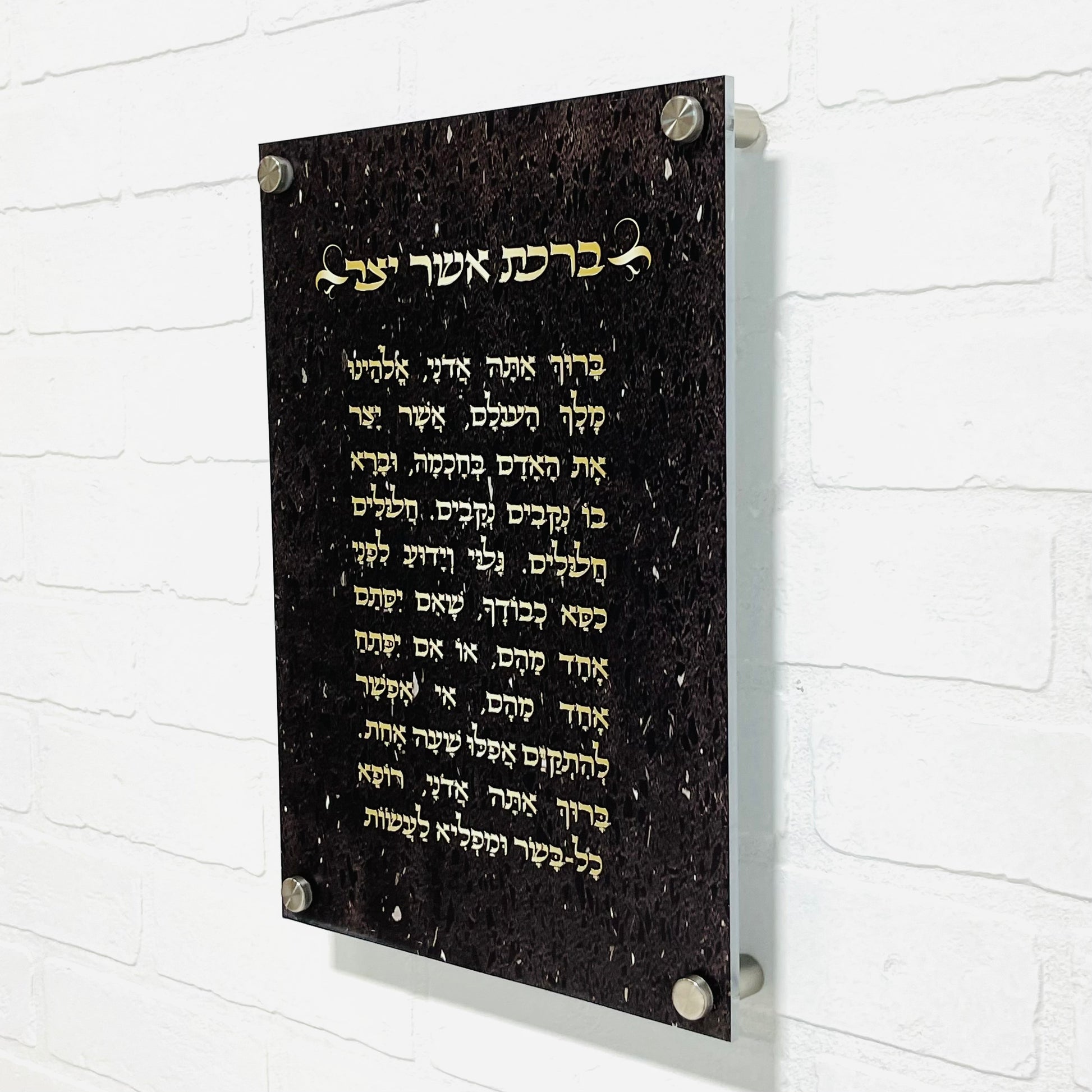 Decorate your home with this lovely wall-mounted Lucite plaque of the Birkat Asher Yatzar, the blessing that thanks Hashem for creating the human body. Our design is durable and classy, making it a stylish decoration for your home, synagogue, or office.