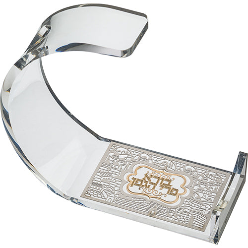 Add a modern and meaningful touch to your Shabbat or festive table with this elegantly curved acrylic wine bottle holder. Crafted from crystal-clear acrylic, it features a detailed silver and gold Jerusalem motif with the Hebrew words “בורא פרי הגפן” (Creator of the fruit of the vine). Both functional and decorative, this piece makes a striking centerpiece or gift for weddings, housewarmings, or Jewish holidays.
