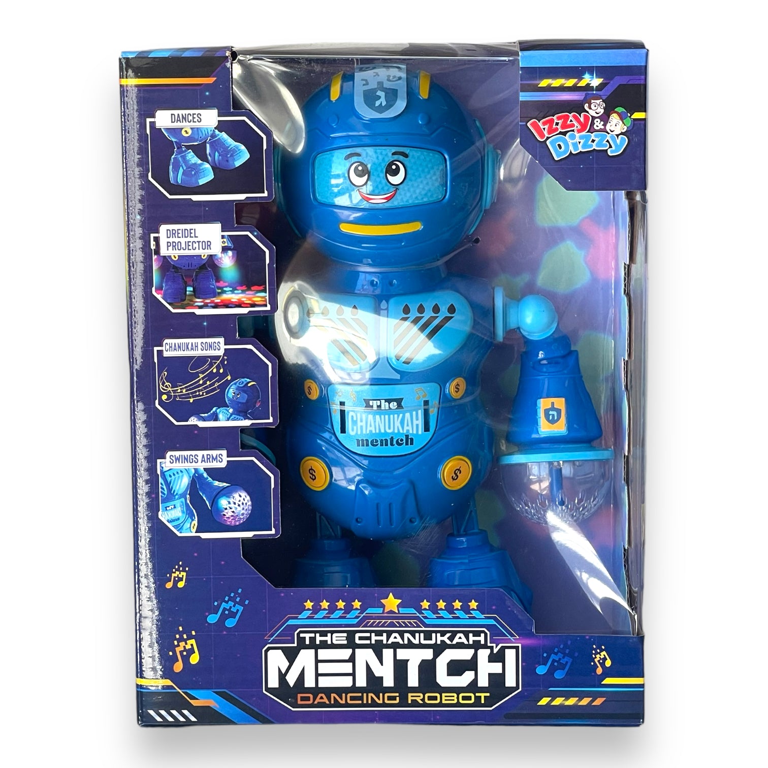 Hanukkah lights and dancing robot singing Hanukkah songs