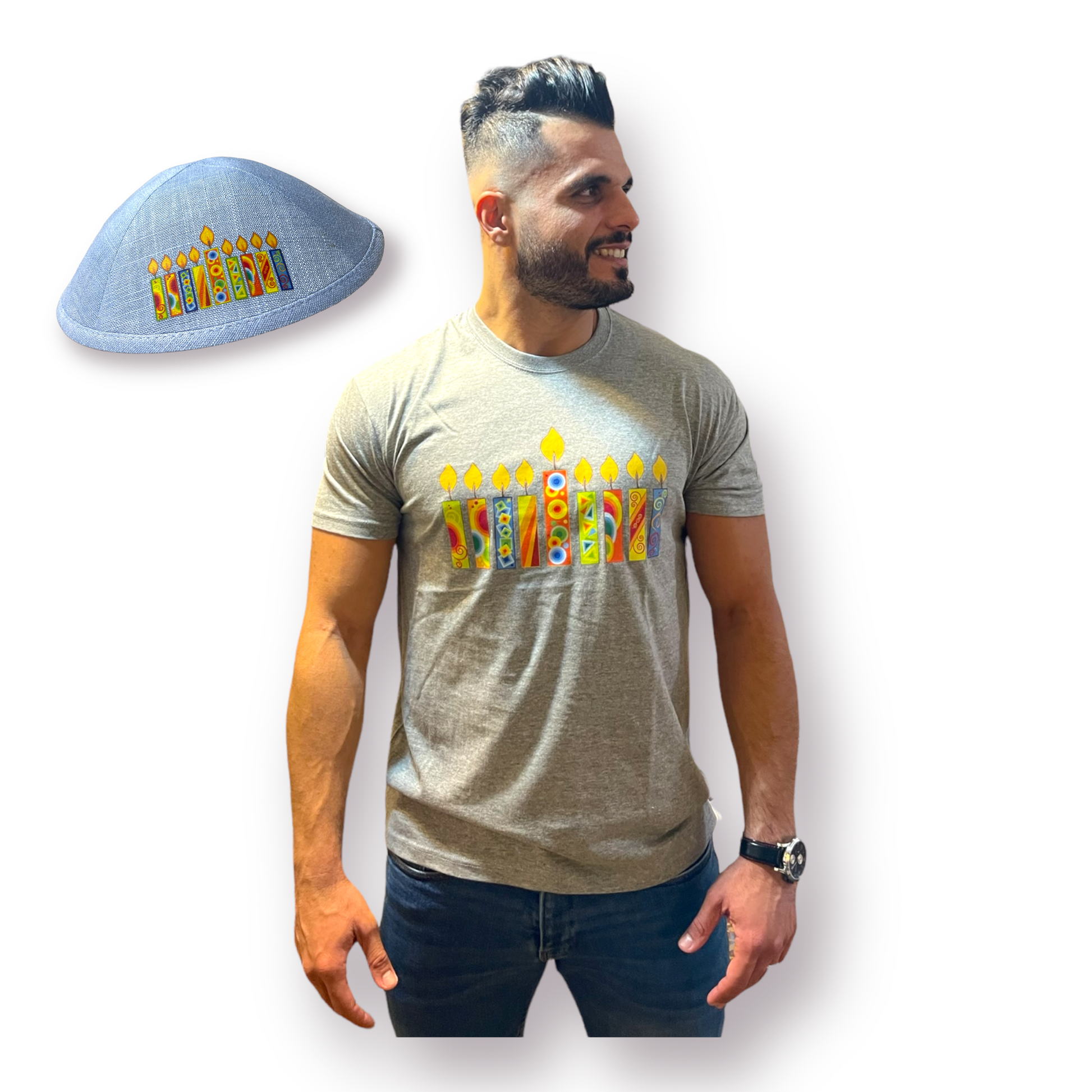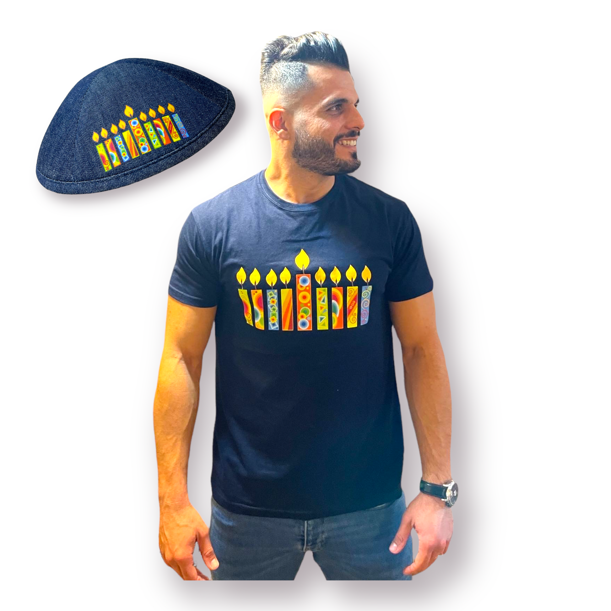 Hanukkah Set Man T-shirt+Kippah colorful hanukkah candles printed
