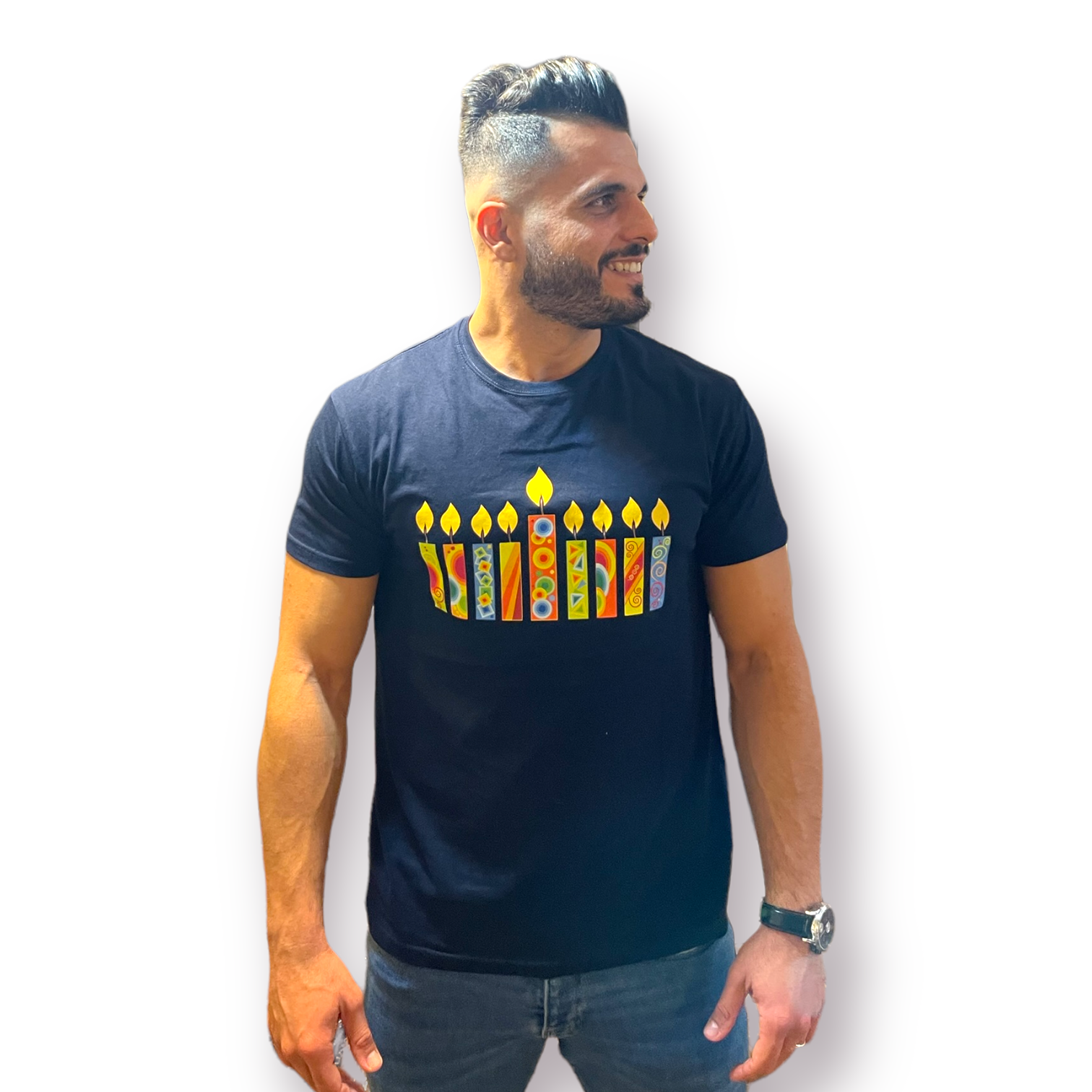 Hanukkah Man T-Shirt happy colorful Hanukkah candles 100% soft cotton