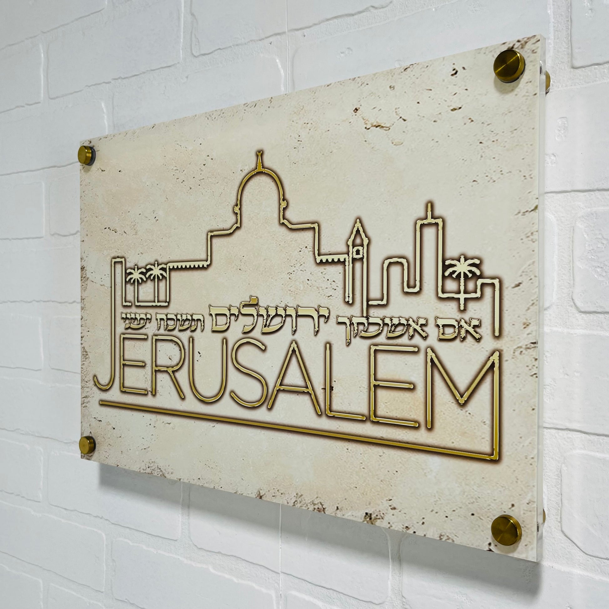Made from sturdy Lucite, this plaque mounts easily to your wall and features a clever printed design of the Jerusalem skyline containing the text of Psalm 137, which reads “If I forget Jerusalem, let my right hand forget its use.”