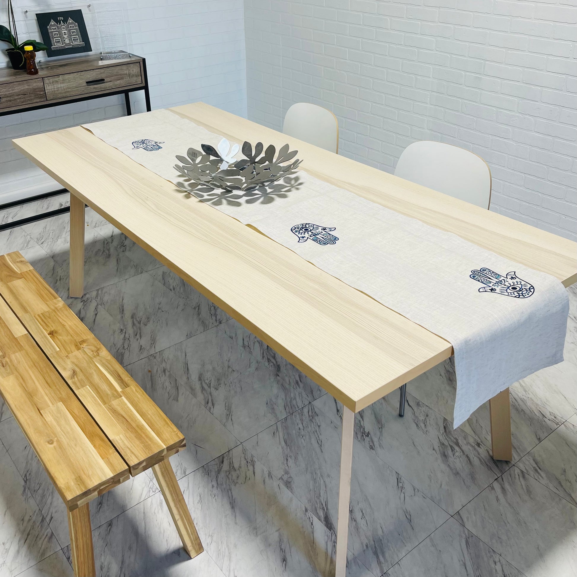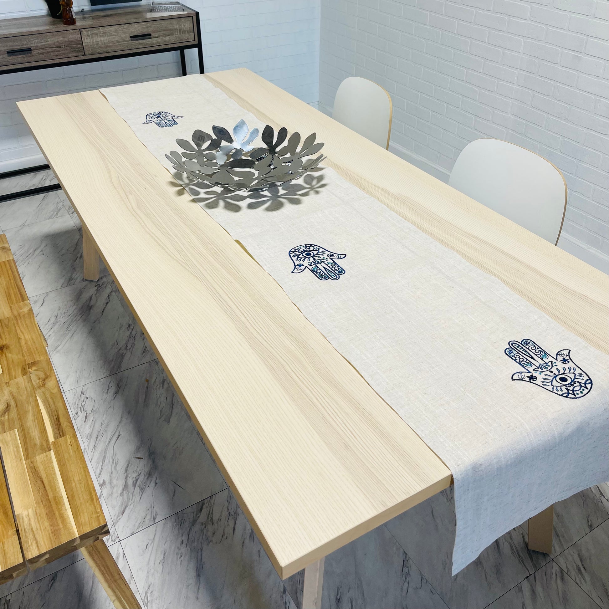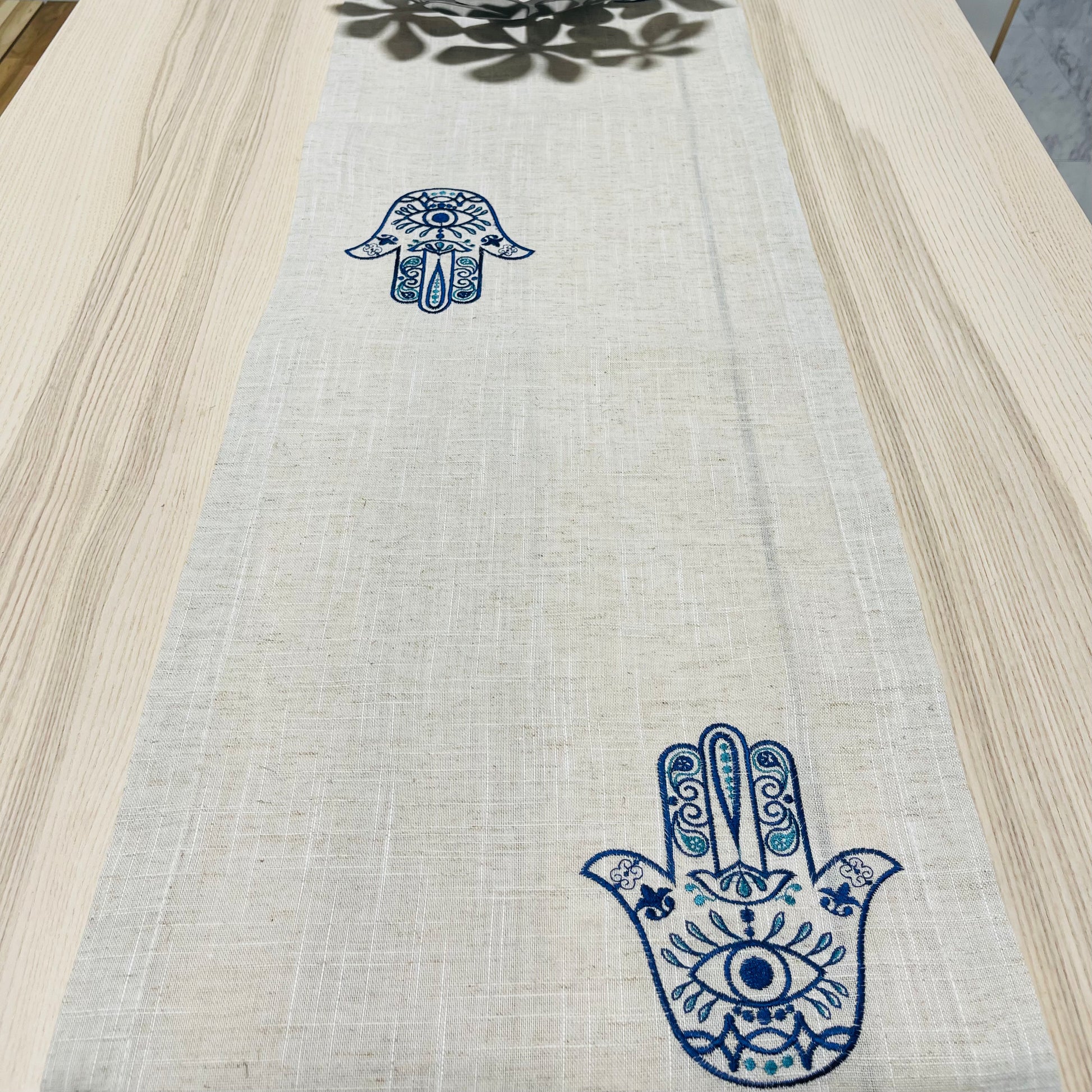 Beige Linen Table Runner Blue Hamsa Embroidred