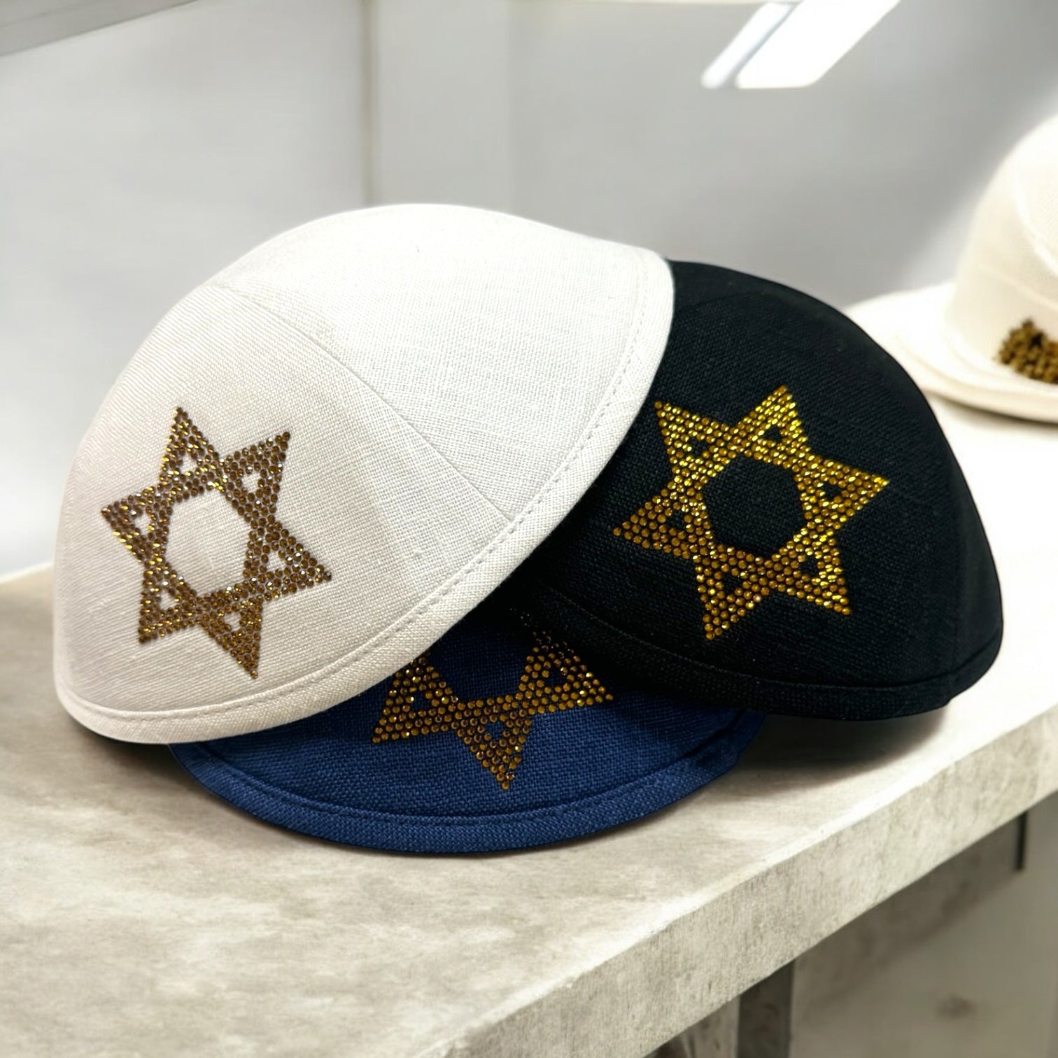 Magen David rhinestone linen kippah different sizes are available