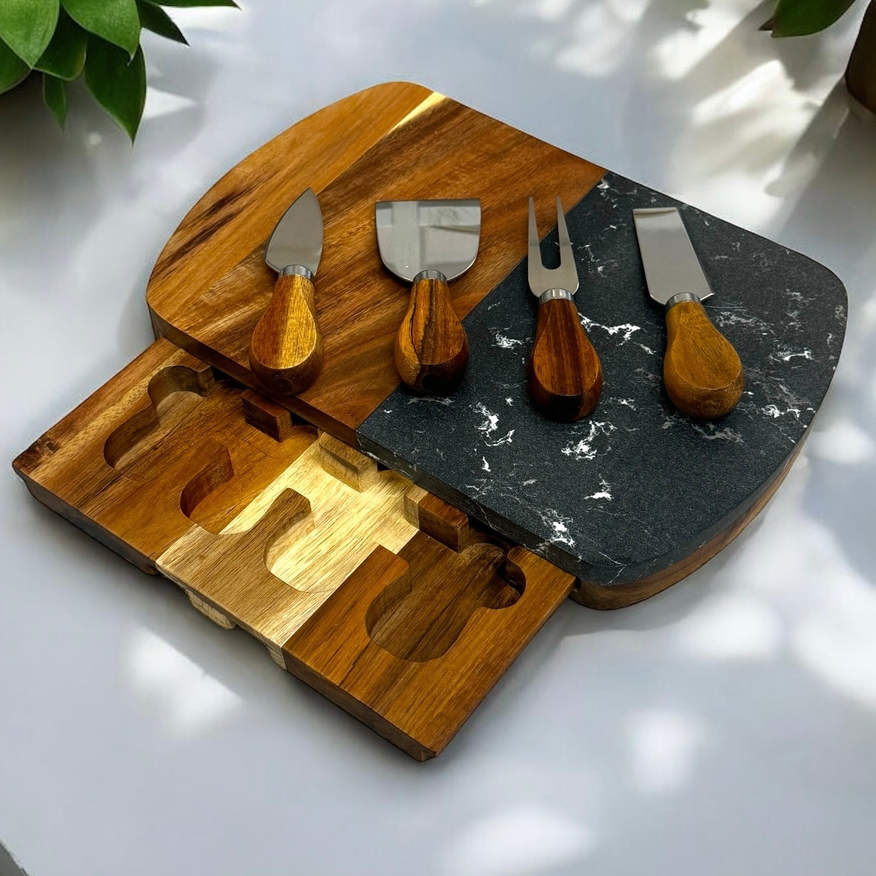 Elegant and Practical: This versatile cutting board set is perfect for wine and cheese nights, casual get-togethers, or any festive occasion. The harmonious blend of black marble and wood not only enhances its functionality but also makes it a centerpiece on any table.