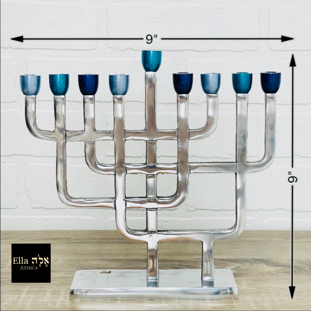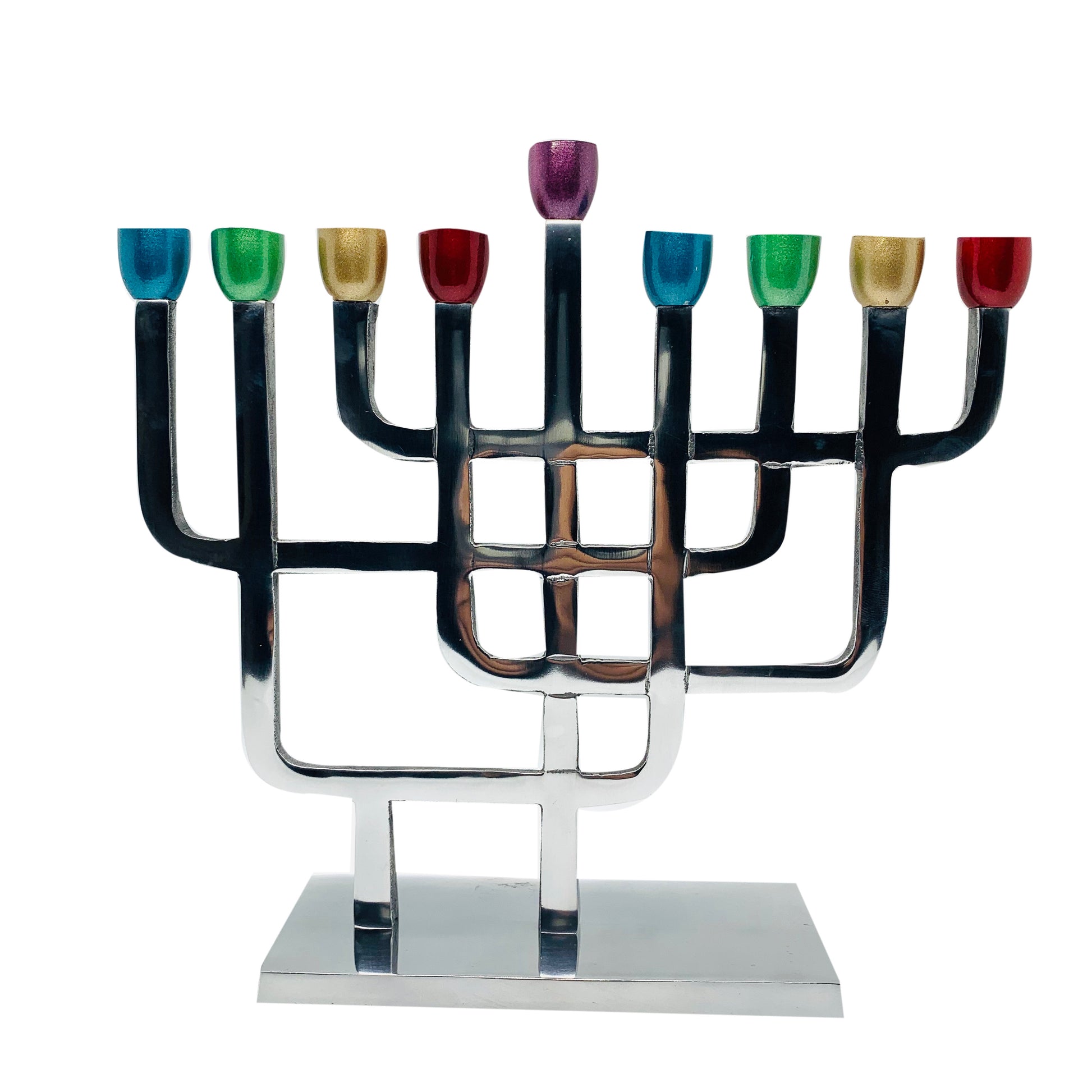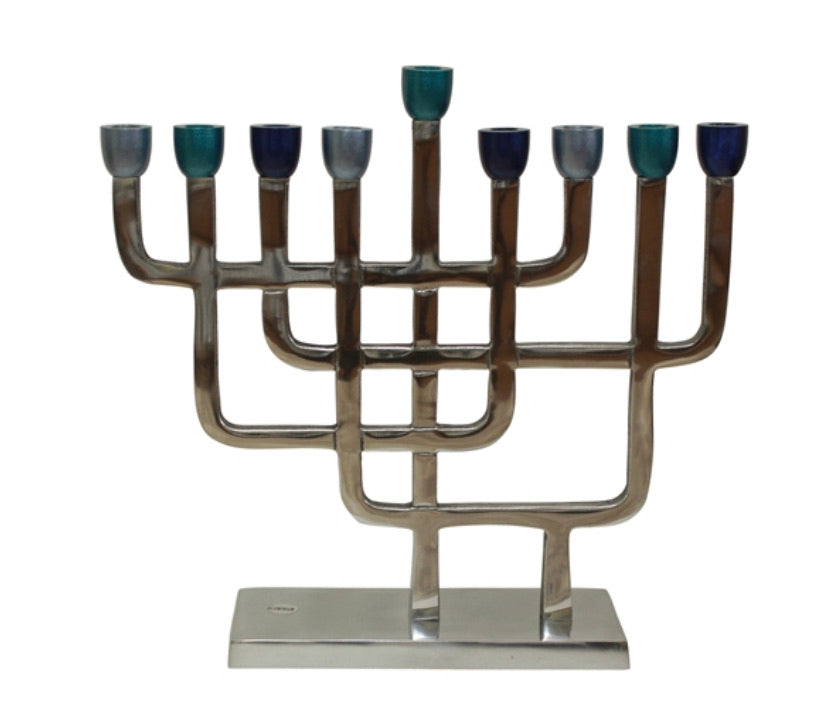 This unique Chanukiah (menorah) is made from sturdy aluminum and finished with nickel plating, polished to a brilliant shine.