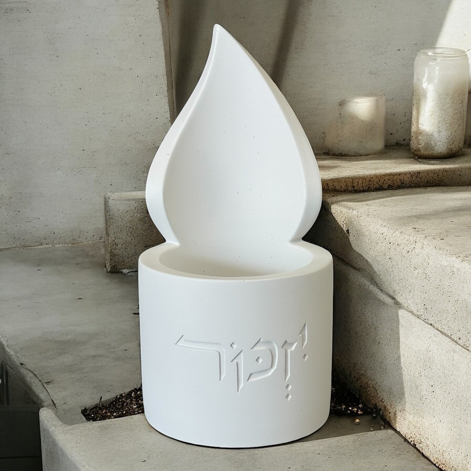 Honor the memory of loved ones with this elegant Ner Neshama memorial candle holder. Crafted from solid white concrete, this modern flame-shaped design features the Hebrew word “יזכור” (Yizkor) in metallic gold — a timeless tribute to those we hold in our hearts.