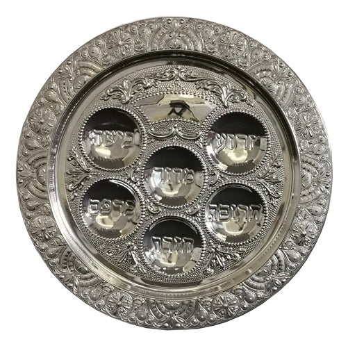 What could be more fitting for your Pesach table than this amazing nickel-plated metal Seder plate? With six bowls adorned with the name of each of the ritual foods placed inside them at the Seder meal in Hebrew and English. At the top is written Pesach and Passover in Hebrew and English. Decorated with circular and floral patterns in the interior and shells around the edges, this wonderful plate will make the perfect centerpiece for your Seder table or a flawless Passover gift for someone close!