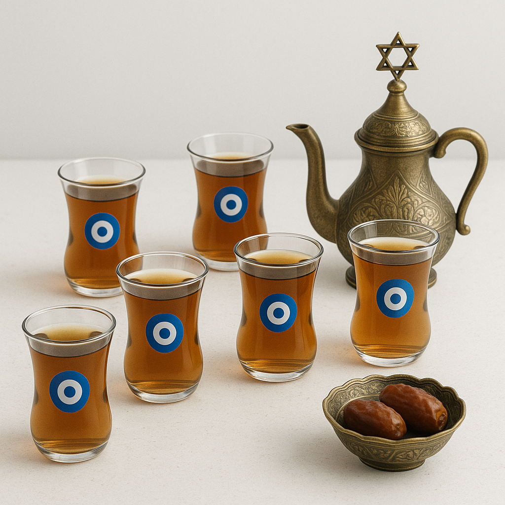 Serve tea with tradition and protection! Set of 6 Turkish tea glasses with evil eye design. Perfect gift or Judaica addition.