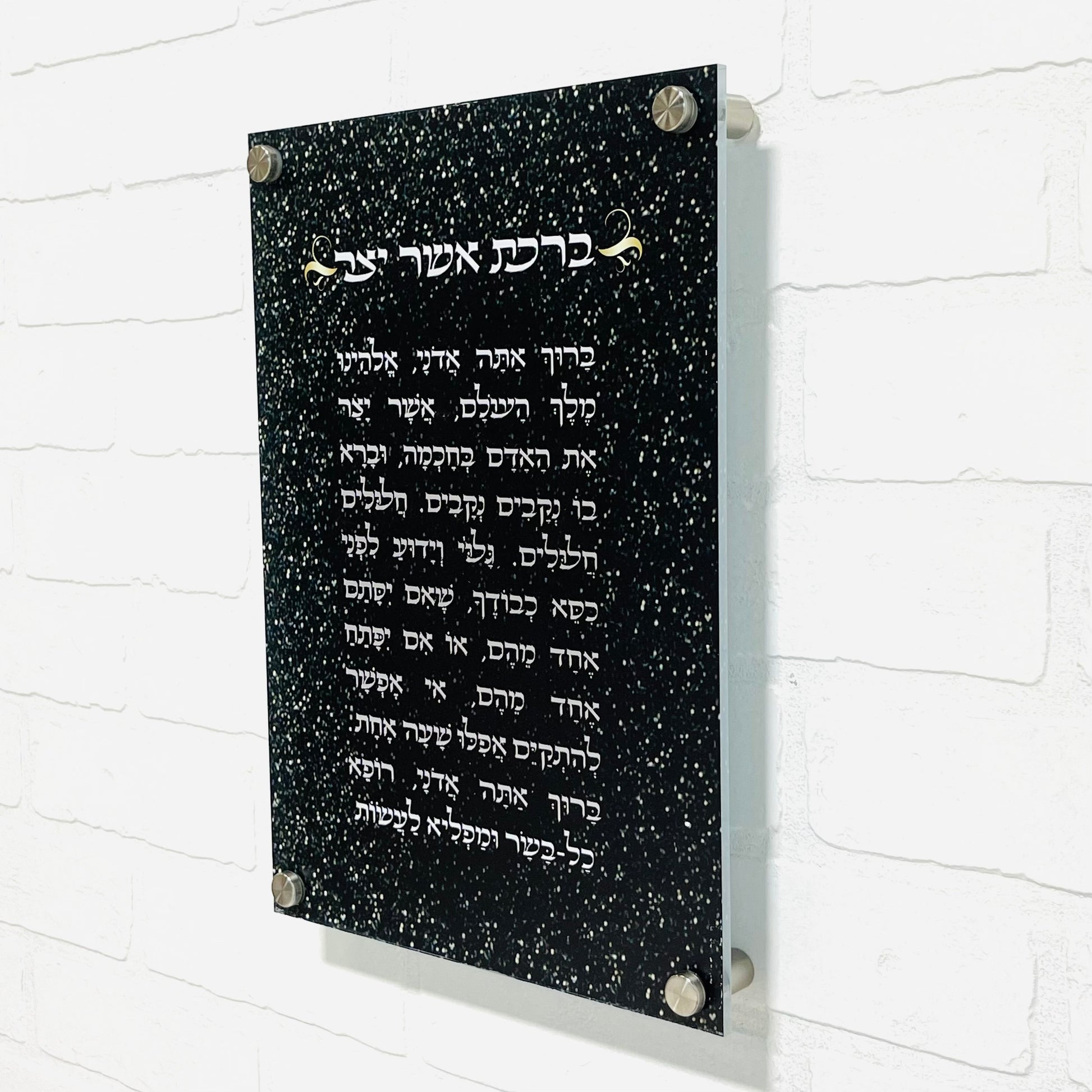 Decorate your home with this lovely wall-mounted Lucite plaque of the Birkat Asher Yatzar, the blessing that thanks Hashem for creating the human body. Our design is durable and classy, making it a stylish decoration for your home, synagogue, or office.