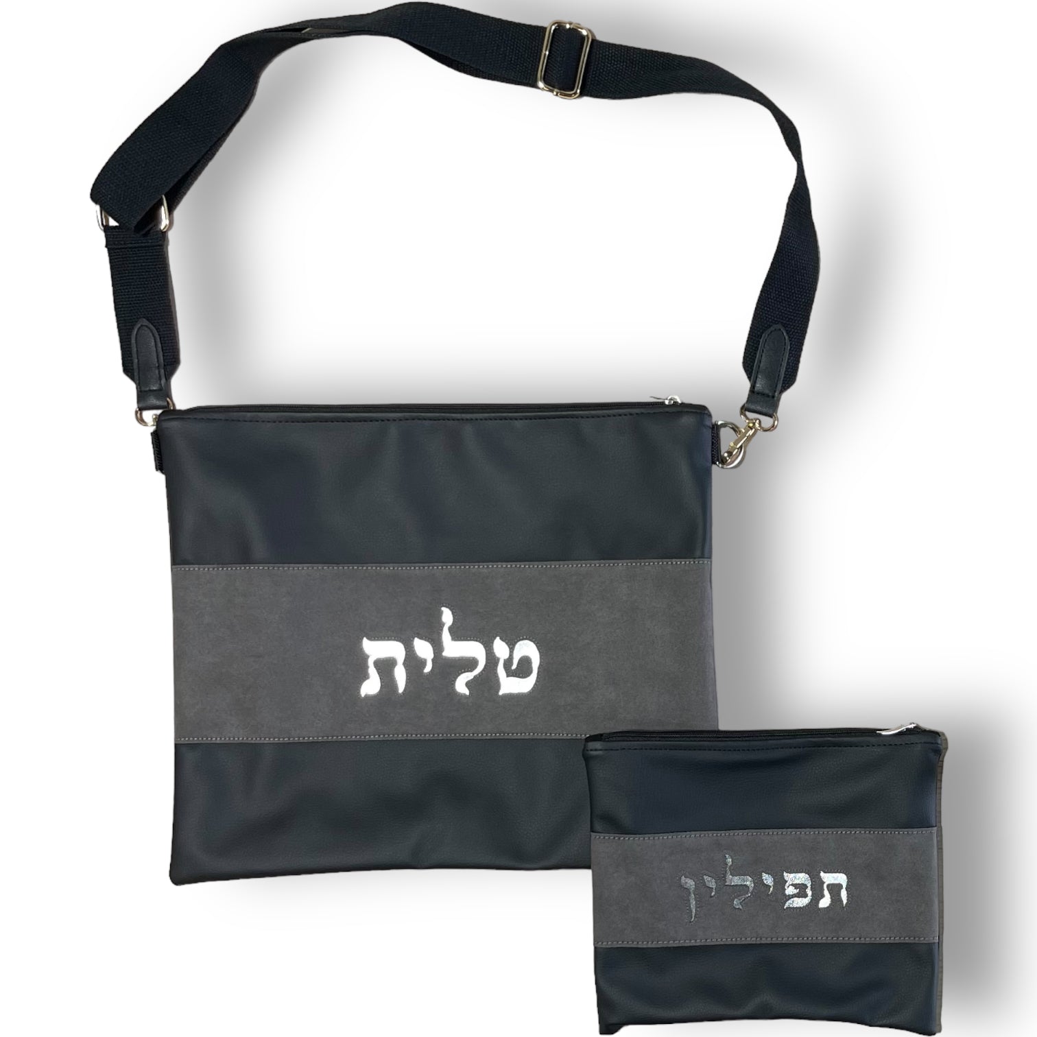 Walk to shul with style with this Fancy Vinyl and suede talit and tefilin bags set with adjustable strap. laser cut wording talit and tefilin. The perfect gift for groom and bar mitzvah