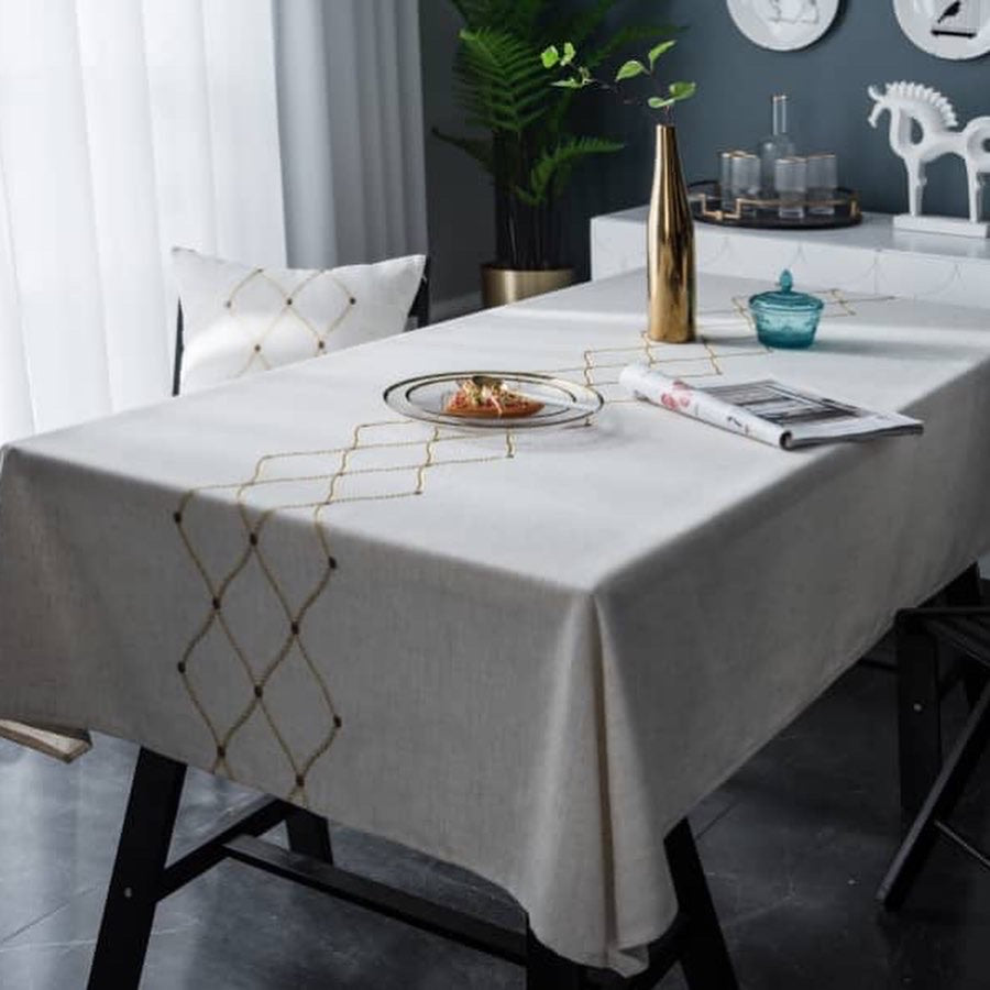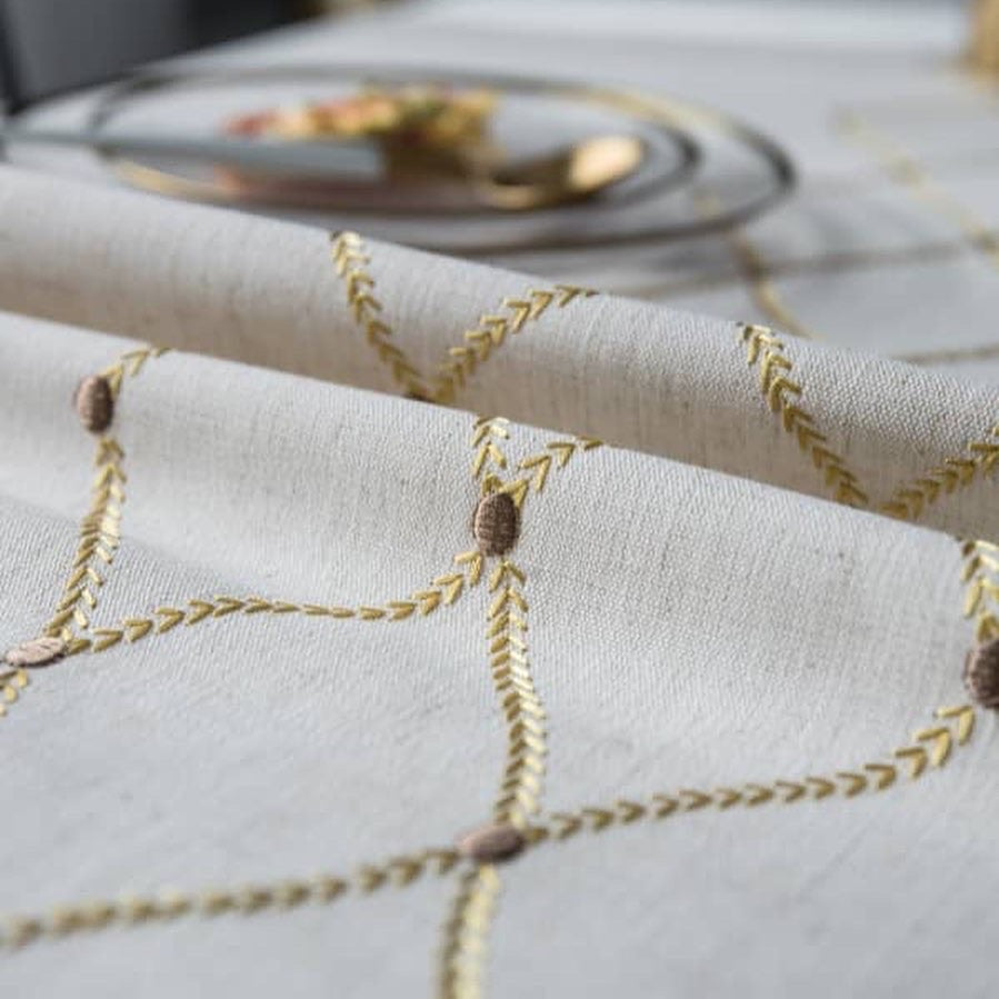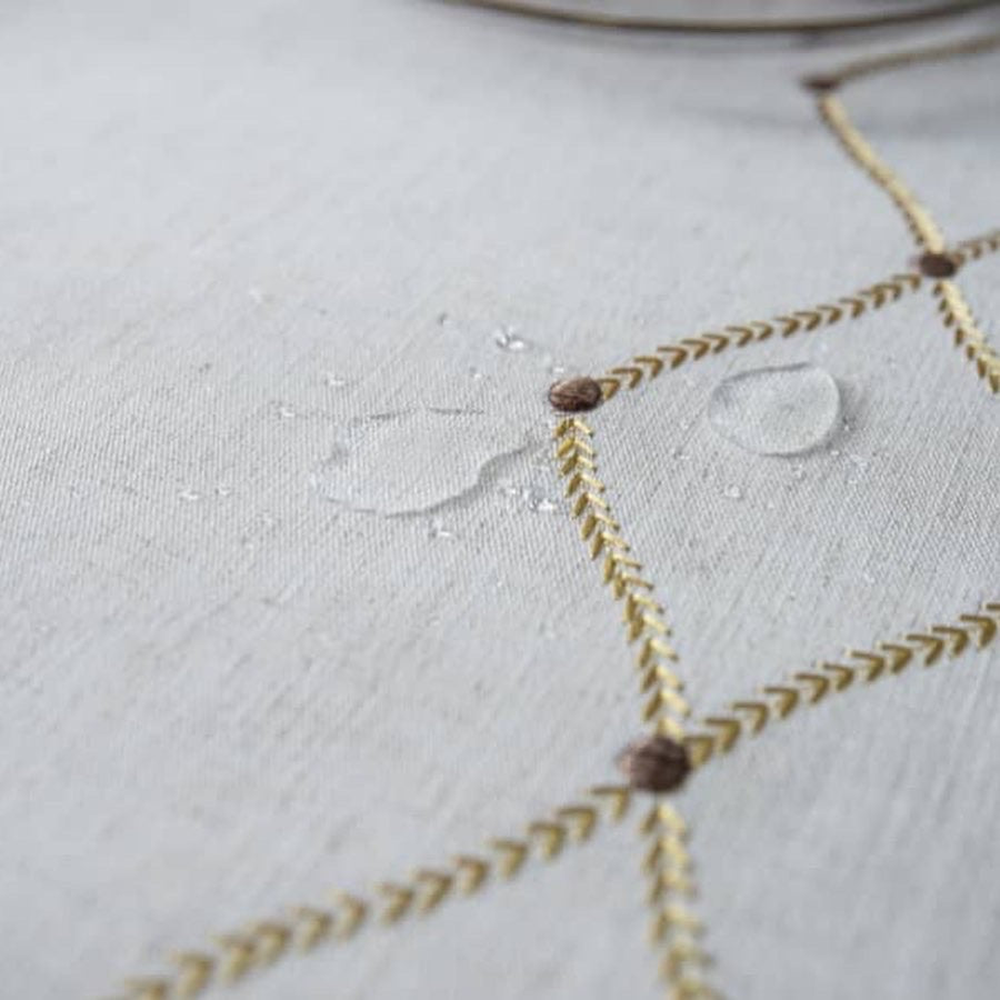 Beautiful golden modern elegant embroidered on thin waterproof soft beige linen.