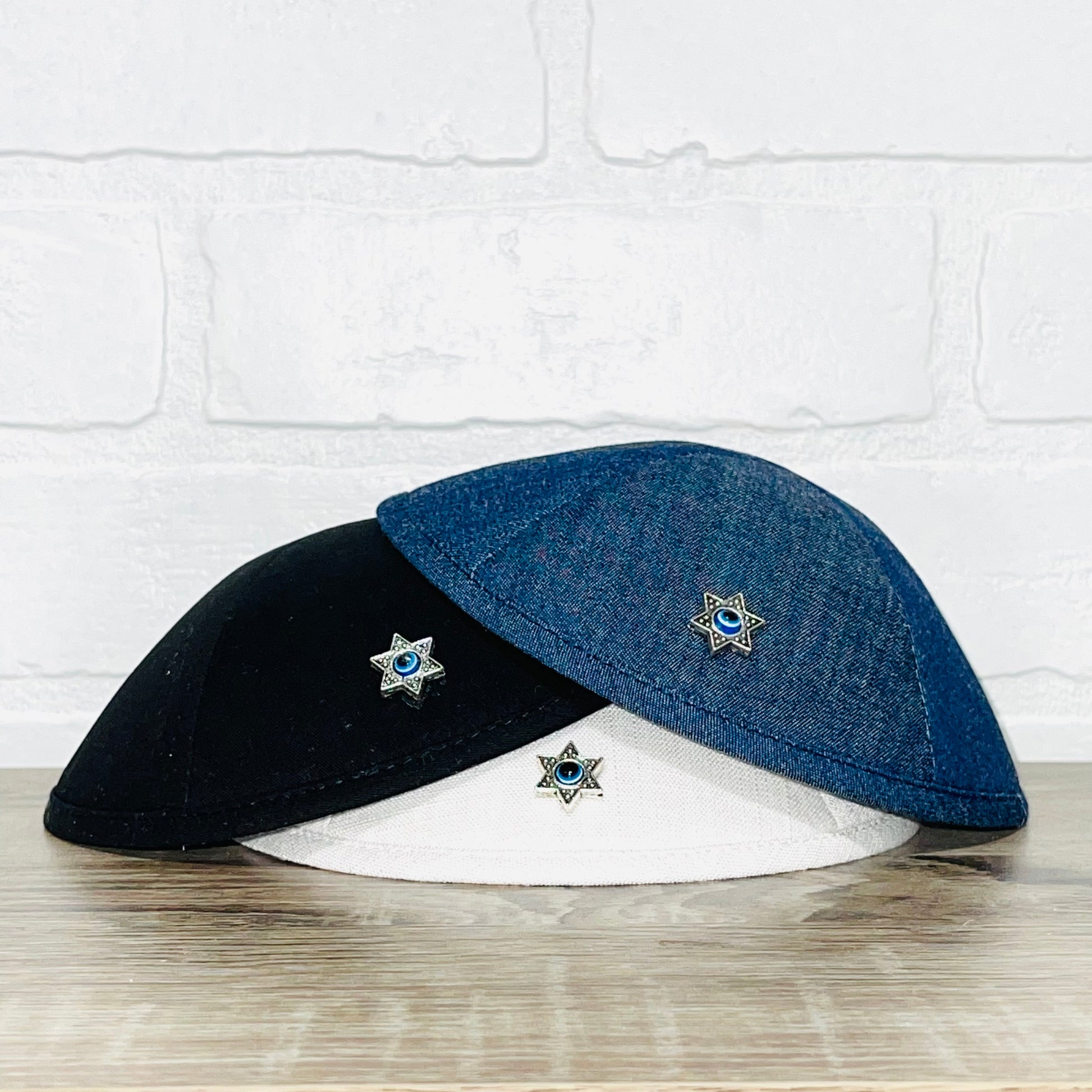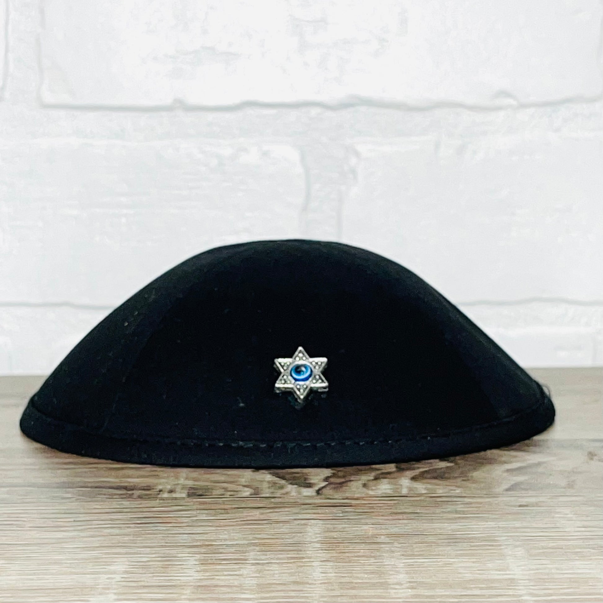 Unique and gorgeous Kippah featuring a Magen David and blue Evil Eye to bring you good health, goodness, fertility, luck and abundance!