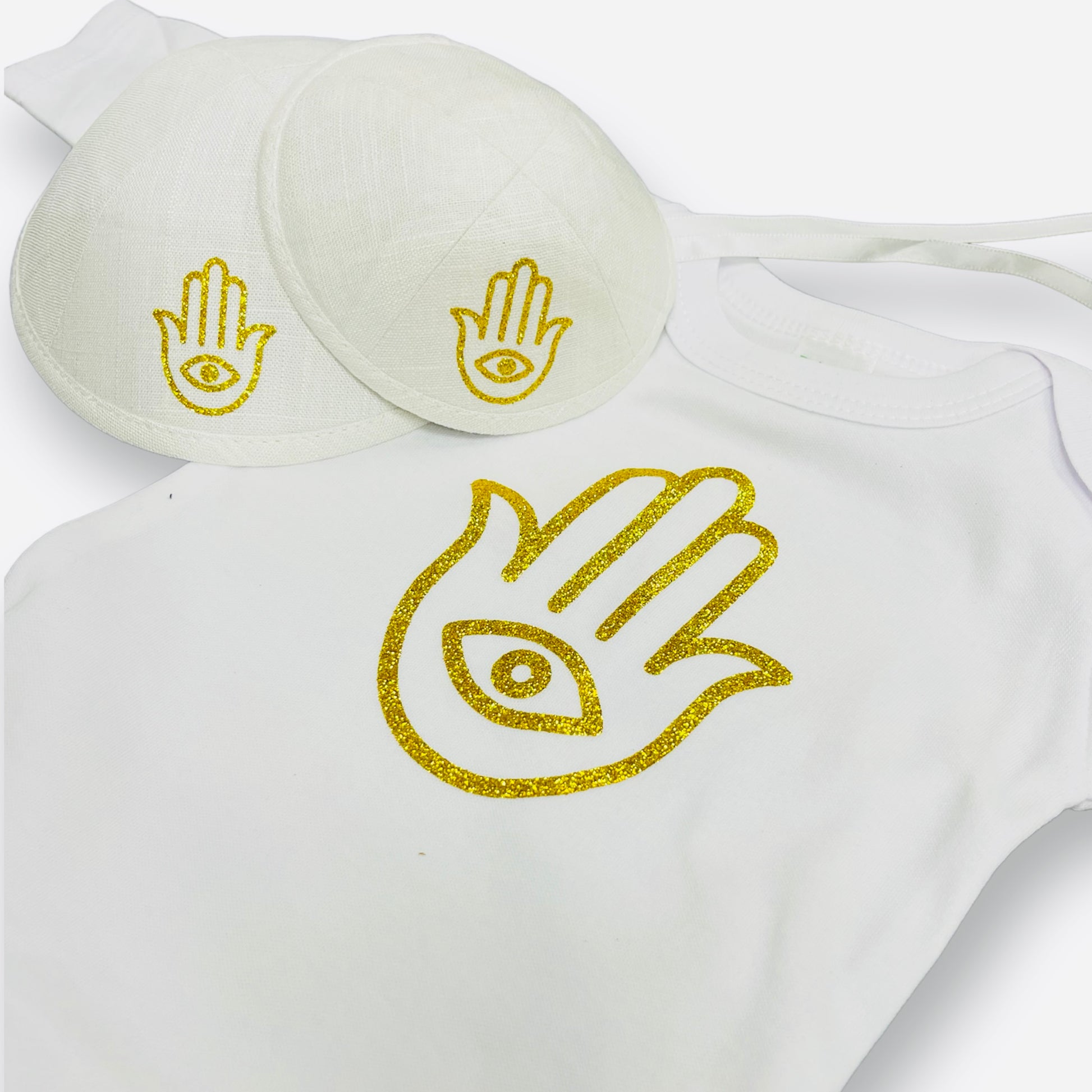 Brit Milah set. Golden hamsa baby gown and matching father baby kippot