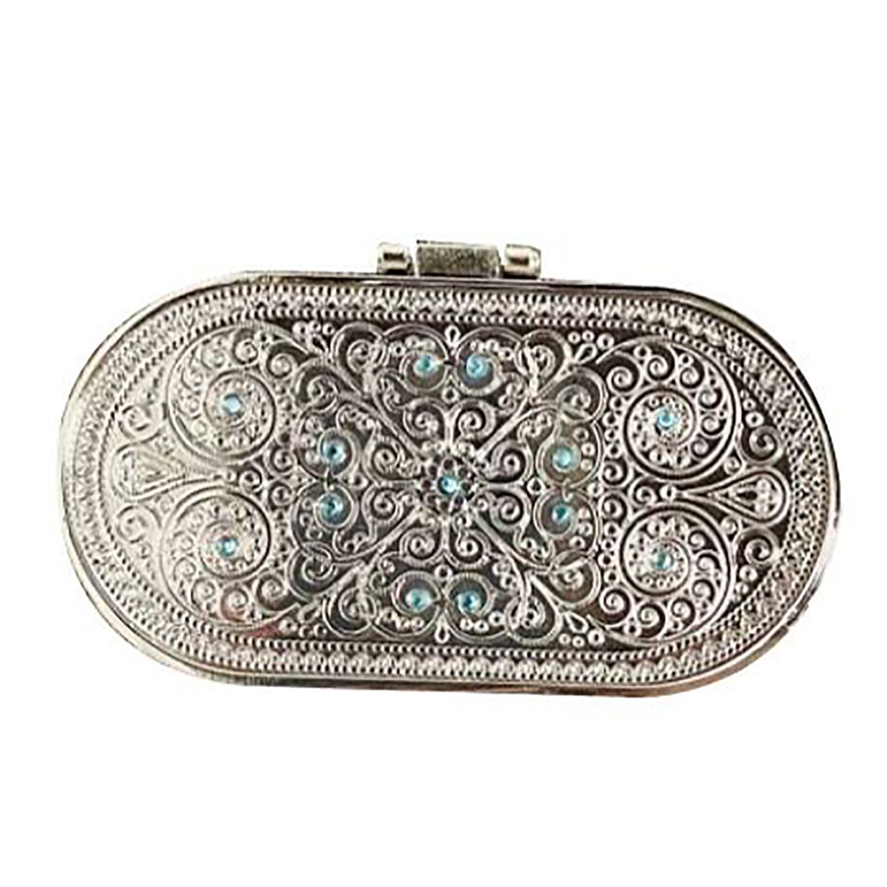 Made from high quality nickel, the box features a lovingly etched illustration of elegant swirling designs on both the lid and rounded sides. Inside the lid, the text of the “hadlakat neirot” (blessing over the lighting of shabbat candles) is inscribed for the user’s convenience.
